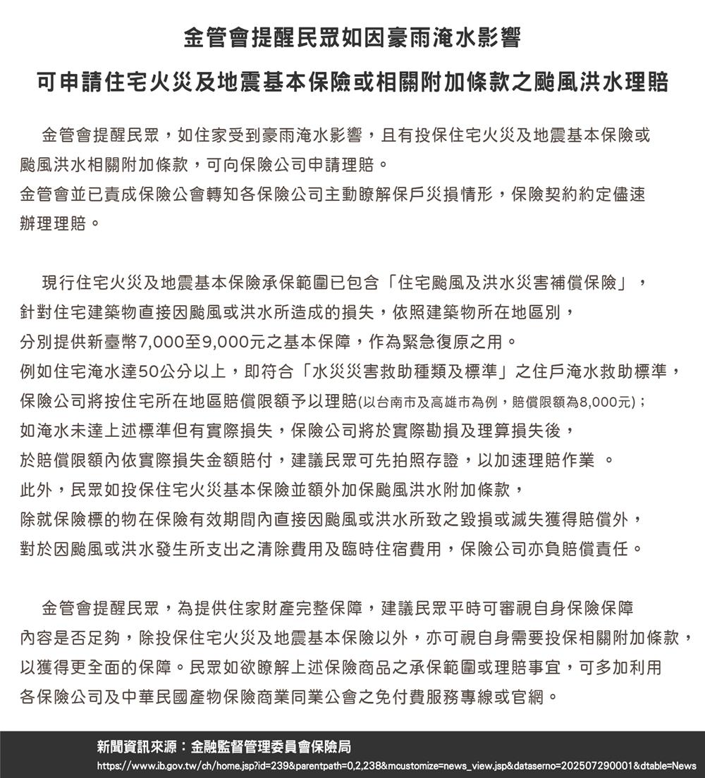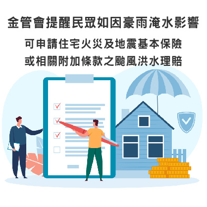 金管會提醒民眾如因豪雨淹水影響可申請住宅火災及地震基本保險或相關附加條款之颱風洪水理賠