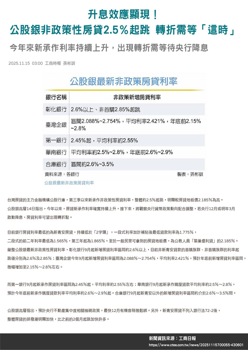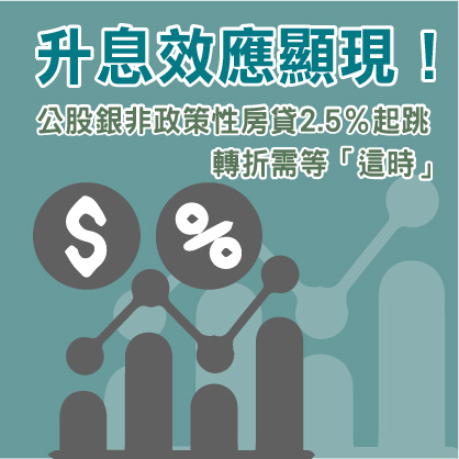 資料來源:經濟日報-升息效應顯現!公股銀非政策性房貸2.5%起跳 轉折需等「這時」