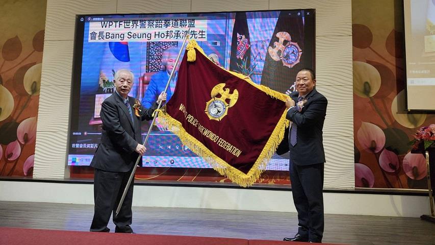 ▲韓國九段教練金世玉(左)為世界警察跆拳道聯盟台灣分會成立授旗